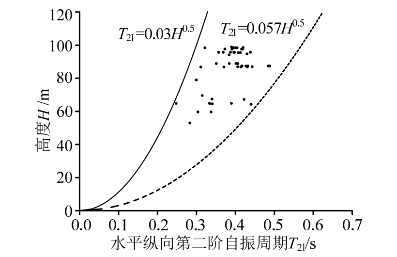 式中:T2l为结构水平纵向第二阶自振周期。该方程的回归分析的决定系数R2=0.570。