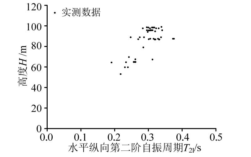 根据实测数据,分别将结构水平纵、横两个方向的第二阶自振周期与结构高度的关系列于图16和图17中。从图中可以看出,高度在45 m~100 m的高层钢筋混凝土剪力墙结构的第二阶自振周期分布范围为:
