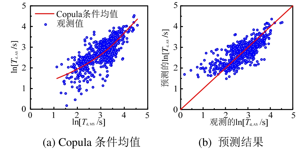 将Copula条件分布进行卷积,即可以得到给定主震地震动强度参数条件下,余震地震动强度参数的条件均值。图6(a)给出了给定主震地震动卓越持时条件下,余震地震动卓越持时的条件均值。从图中可以看出,Copula条件均值能够反映出给定主震地震动强度参数条件下,余震地震动强度参数的总体趋势。因此,可以利用Copula条件均值来预测给定主震地震动强度参数条件下,余震地震动参数的取值。图6(b)给出了给定主震卓越持时条件下,利用Copula条件均值预测的余震地震动卓越持时。从图6(b)中可以看出,余震卓越持时的预测值和观测值较为一致。当余震卓越持时较小时,预测值要比观测值稍微大。其主要原因是当主震地震动卓越持时较小时,余震卓越持时的Copula条件均值较大。