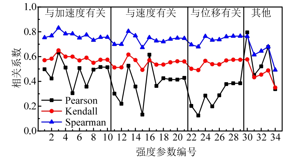 编号 名称 相关系数 编号 名称 相关系数P K S P K S 1 PGA 0.50 0.57 0.75 18 PSV 0.43 0.54 0.72 2Arms 0.43 0.58 0.77 19 EPV 0.42 0.55 0.74 3 CAV 0.63 0.65 0.83 20 SI 0.41 0.56 0.75 4Ars 0.51 0.60 0.78 21 VSI 0.43 0.56 0.75 5IA 0.31 0.60 0.78 22 PGD 0.20 0.50 0.70 6Ia 0.51 0.57 0.75 23Drms 0.13 0.49 0.68 7Ic 0.36 0.59 0.78 24 CAI 0.29 0.57 0.76 8 PSA 0.50 0.55 0.73 25Drs 0.20 0.54 0.73 9 ASI 0.52 0.57 0.76 26Id 0.29 0.54 0.74 10 EPA 0.51 0.58 0.76 27 PSD 0.38 0.57 0.76 11 PGV 0.30 0.51 0.70 28 EPD 0.39 0.58 0.77 12Vrms 0.22 0.51 0.70 29 DSI 0.39 0.58 0.77 13 CAD 0.53 0.62 0.81 30TD 0.80 0.58 0.76 14Vrs 0.34 0.57 0.77 31FR1 0.45 0.43 0.62 15IA,M 0.13 0.49 0.67 32FR2 0.52 0.46 0.65 16Iv 0.62 0.57 0.75 33Ω 0.68 0.49 0.68 17IF 0.36 0.54 0.73 34Tg 0.34 0.35 0.49