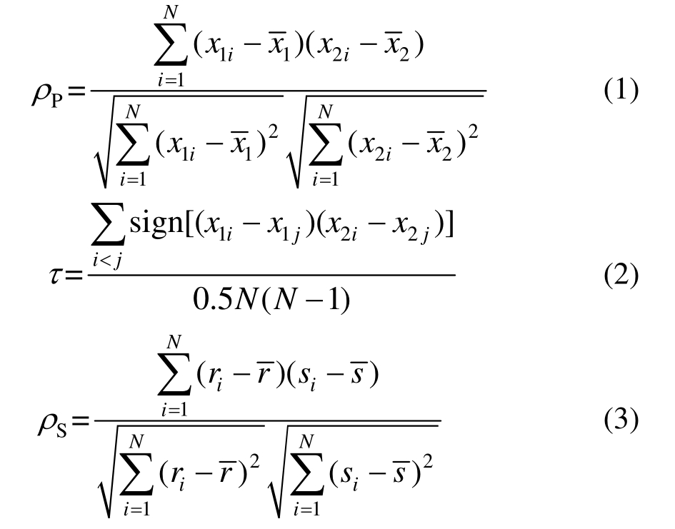 相关系数可以直观地反映主震和余震地震动强度参数之间相关性的强弱。本文选取三种不同类型的相关系数:Pearson线性相关系数、Kendall秩相关系数、Spearman秩相关系数。它们可分别用来反映变量间线性相关程度、一致性变化程度以及单调相关程度[36],计算公式分别为: