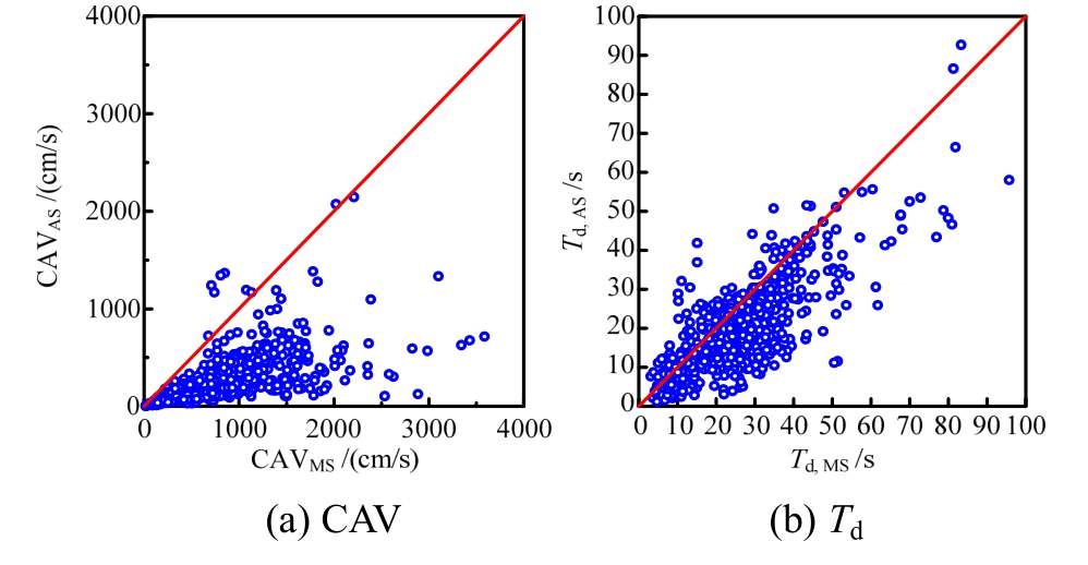 图2给出了累积绝对速度(CAV)和卓越持时(Td)的散点图。从图中可以看出,对于大多数主震地震动而言,其CAV和Td要比余震地震动大。此外,随着主震地震动参数的增大,余震地震动CAV的离散性逐步增强,而卓越持时的离散性相对比较稳定。