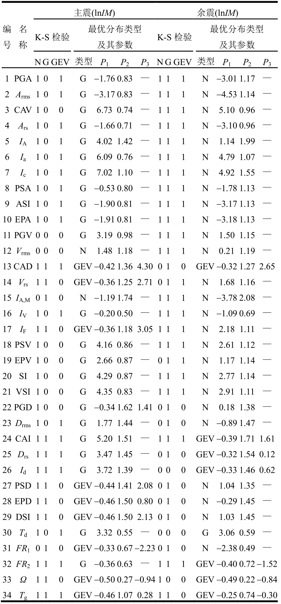 主震(lnIM) 余震(lnIM)编号名称K-S检验 最优分布类型及其参数 K-S检验 最优分布类型及其参数NGGEV类型P1P2P3 N G GEV 类型P1P2P3 1PGA10 1 G -1.760.83— 1 1 1 N -3.011.17—2Arms10 1 G -3.170.83— 1 1 1 N -4.531.14—3CAV10 0 G 6.730.74 — 1 1 1 N 5.100.96—4Ars10 1 G -1.660.71— 1 1 1 N -3.100.96—5IA 10 1 G 4.021.42 — 1 1 1 N 1.141.99—6Ia 10 1 G 6.090.76 — 1 1 1 N 4.791.07—7Ic 10 1 G 7.021.10 — 1 1 1 N 4.921.55—8PSA10 1 G -0.530.80— 1 1 1 N -1.781.13—9ASI10 1 G -1.900.81— 1 1 1 N -3.171.13—10EPA10 1 G -1.910.81— 1 1 1 N -3.181.13—11PGV00 0 G 3.190.98 — 1 1 1 N 1.501.15—12Vrms00 0 N 1.481.18 — 1 1 1 N 0.211.19—13CAD11 1 GEV-0.421.364.30 0 1 0 GEV -0.321.272.65 14Vrs11 0 GEV-0.361.252.71 0 1 1 N 1.681.16 —15IA,M01 0 N -1.191.74— 1 1 1 N -3.782.08—16IV 10 1 G -0.200.50— 1 1 1 N -1.090.69—17IF 11 0 GEV-0.361.183.05 1 1 1 N 2.181.11 —18PSV10 0 G 4.160.86 — 1 1 1 N 2.611.12—19EPV10 0 G 2.660.87— 0 1 1 N 1.171.14—20SI10 0 G 4.290.87 — 1 1 1 N 2.771.14—21VSI10 0 G 4.350.83— 1 1 1 N 2.911.11—22PGD10 0 G -0.341.621.41 0 1 0 N 0.181.38 —23Drms10 1 G 1.771.44 — 0 1 0 N -0.891.47—24CAI11 1 G 5.201.51 — 1 1 1 GEV -0.391.711.61 25Drs11 1 G 3.471.45 — 0 1 0 GEV -0.321.540.12 26Id 11 1 G 3.721.39 — 0 0 0 GEV -0.331.460.62 27PSD11 0 GEV-0.441.412.08 0 1 0 N 1.041.35 —28EPD11 0 GEV-0.461.500.80 0 1 0 N -0.291.45 —29DSI11 0 GEV-0.461.502.13 0 1 0 N 1.031.45 —30Td10 1 G 3.320.55 — 0 0 0 G 3.060.59—31FR101 0 GEV-0.330.67-2.23 0 1 0 N -2.380.49 —32FR211 1 G -0.360.63 — 1 1 1 GEV -0.400.72-1.52 33Ω110 GEV-0.500.27-0.94 1 0 0 GEV -0.490.22-0.84 34Tg11 1 GEV-0.461.070.28 1 1 0 GEV -0.250.74-0.30