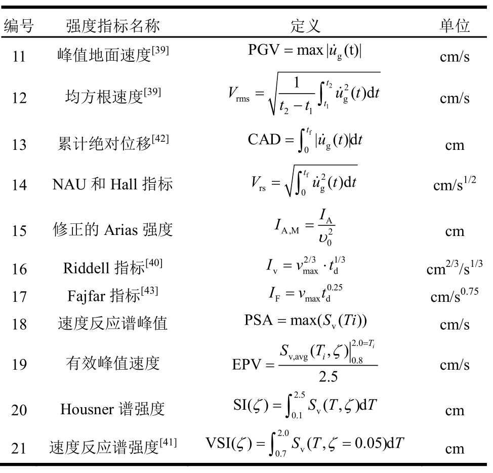编号 强度指标名称 定义 单位PGV max|u(t)|11 峰值地面速度[39] g= ˙ cm/s 12 均方根速度[39]V 2 1 ()d tt 2=- ∫˙ cm/s utt tt rms g 2 1 1 13 累计绝对位移[42]f CAD |()|d tutt=∫˙ cm 0 g t 14 NAU和Hall指标f 2 rs g Vutt=∫˙ cm/s1/20 ()d I I =υ cm 16 Riddell指标[40]2/31/3 15 修正的Arias强度A A,M 2 0 I=v ·t cm2/3/s1/3 17 Fajfar指标[43]0.25 v max d I=vt cm/s0.75 18 速度反应谱峰值v F maxd PSA max(S(Ti))=cm/s 19 有效峰值速度STζ==2.0 v,avg 0.8(,)EPV 2.5 iT i cm/s=∫ cm 21 速度反应谱强度[41]2.0 2.5 20 Housner谱强度SI() (,)d ζ 0.1 STT vζ VSI() (,0.05)d ζ=∫0.7 STT vζ=cm