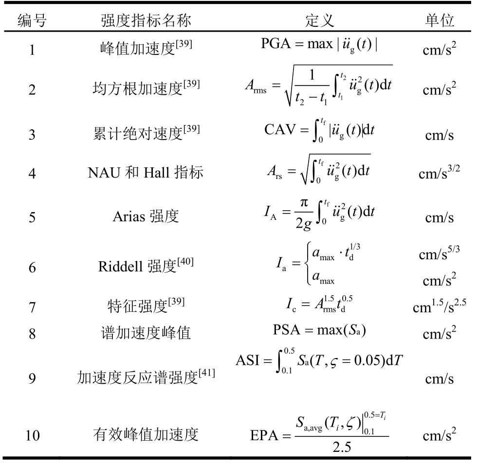 编号 强度指标名称 定义 单位PGA max|u(t)|1 峰值加速度[39] g= ˙˙ cm/s2 2 均方根加速度[39]A 1 ()d tt 2 2=- ∫˙˙ cm/s2 utt tt rms g 2 1 1 3 累计绝对速度[39]tutt=∫˙˙ cm/s f CAV |()|d 0 g t 4 NAU和Hall指标Autt f 2 rs g= ∫˙˙ cm/s3/20 ()d t 5 Arias强度f 2 A g 0 π ()d 2= ∫˙˙ cm/s Iutt g 1/3 max d a max 6 Riddell强度[40]■ ·■cm/s5/3 cm/s2 7 特征强度[39]1.50.5 at Ia=■■I=At cm1.5/s2.5 8 谱加速度峰值a c rmsd PSA max(S)= cm/s2 a ASI (,0.05)d 9 加速度反应谱强度[41]=∫0.5 0.1 STT ς=cm/s STζ==0.5 a,avg 0.1(,)EPA 2.5 iT 10 有效峰值加速度i cm/s2