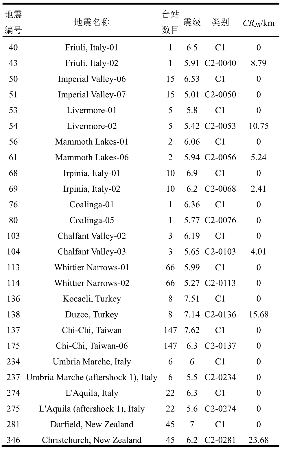 地震编号 地震名称 台站数目 震级 类别CRJB/km 40 Friuli,Italy-01 1 6.5 C1 0 43 Friuli,Italy-02 1 5.91 C2-0040 8.79 50 Imperial Valley-06 15 6.53 C1 0 51 Imperial Valley-07 15 5.01 C2-0050 0 53 Livermore-01 5 5.8 C1 0 54 Livermore-02 5 5.42 C2-0053 10.75 56 Mammoth Lakes-01 2 6.06 C1 0 61 Mammoth Lakes-06 2 5.94 C2-0056 5.24 68 Irpinia,Italy-01 10 6.9 C1 0 69 Irpinia,Italy-02 10 6.2 C2-0068 2.41 76 Coalinga-01 1 6.36 C1 0 80 Coalinga-05 1 5.77 C2-0076 0 103 Chalfant Valley-02 3 6.19 C1 0 104 Chalfant Valley-03 3 5.65 C2-0103 4.01 113 Whittier Narrows-01 66 5.99 C1 0 114 Whittier Narrows-02 66 5.27 C2-0113 0 136 Kocaeli,Turkey 8 7.51 C1 0 138 Duzce,Turkey 8 7.14 C2-0136 15.68 137 Chi-Chi,Taiwan 147 7.62 C1 0 175 Chi-Chi,Taiwan-06 147 6.3 C2-0137 0 234 Umbria Marche,Italy 6 6 C1 0 237 Umbria Marche (aftershock 1),Italy 6 5.5 C2-0234 0 274 L'Aquila,Italy 22 6.3 C1 0 275 L'Aquila (aftershock 1),Italy 22 5.6 C2-0274 0 281 Darfield,New Zealand 45 7 C1 0 346 Christchurch,New Zealand 45 6.2 C2-0281 23.68