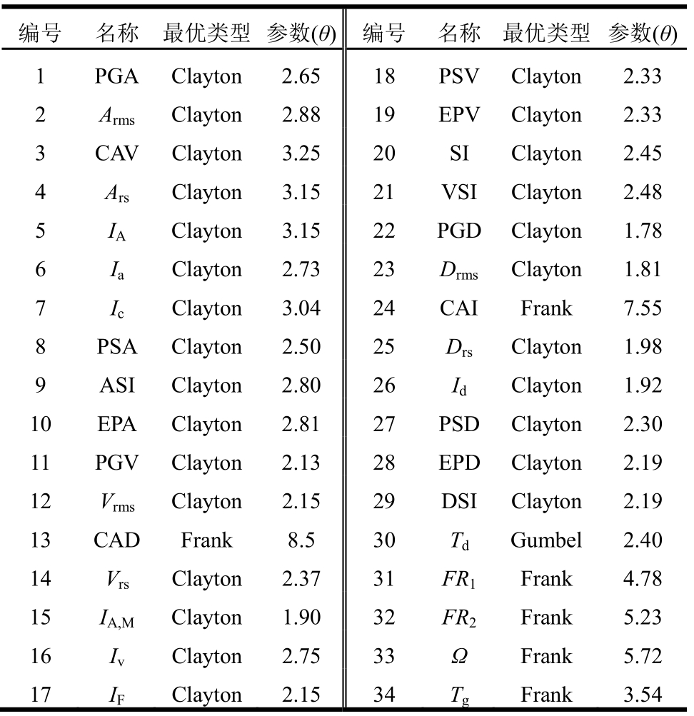 表8给出了主震和余震地震动强度参数之间的最优Copula函数及其参数。与加速度、速度和位移有关的地震动强度参数,其最优Copula函数几乎全是Clayton Copula函数,仅CAD和CAI的最优Copula函数为Frank Copula函数。其他地震动强度参数中,只有卓越持时的最优Copula函数为Gumbel Copula函数,其他地震动强度参数则全是Frank Copula函数。