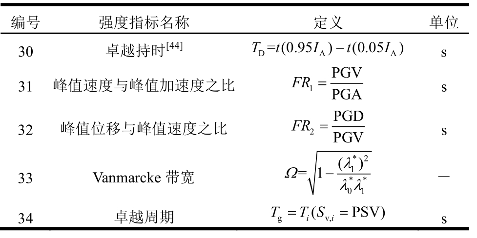 本文共选取34个不同的地震动强度参数,按照其定义以及计算公式分为以下四类:与加速度有关的强度参数(10个)、与速度有关的强度参数(11个)、与位移有关的强度参数(8个)以及其他强度参数(5个)。