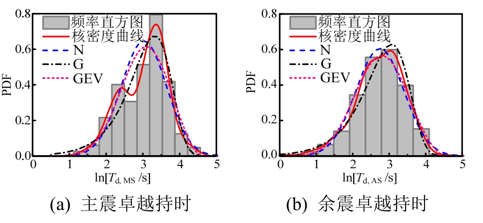 图3给出了主震和余震地震动卓越持时的概率密度函数。根据概率直方图初步选择了三种备选概率模型,它们分别是正态分布(N)、Gumbel分布(G)和广义极值分布(Generalized Extreme Value distribution,GEV)。然后利用K-S检验对备选概率模型进行验证,其结果显示有的强度参数有两种或者两种以上概率模型通过了假设检验,例如PGV、PGD等。鉴于上述情况,则借助AIC准则和BIC准则确定最优概率模型。表7给出了所选34个强度参数的最优概率模型及其参数。为了方便讨论,后续的分布模型都是针对取自然对数之后的强度参数而言。