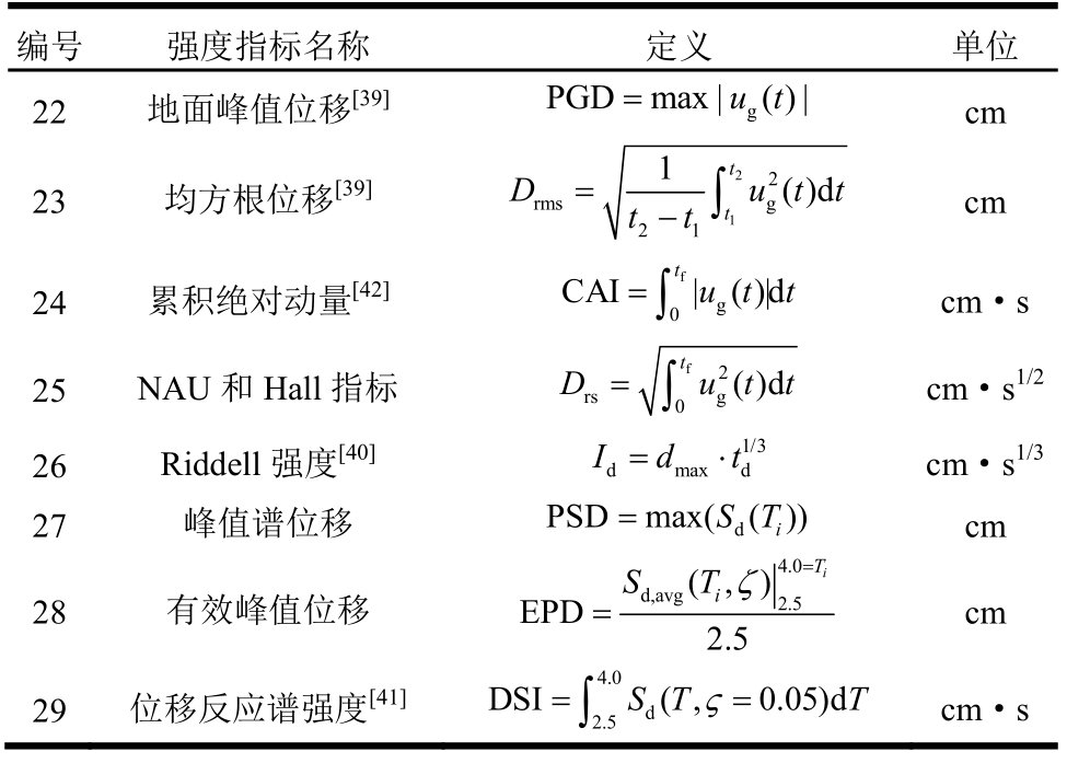 编号 强度指标名称 定义 单位PGD max|u(t)|=22 地面峰值位移[39] g cm 23 均方根位移[39]D 1 ()d tt 2 2=- ∫ cm utt tt rms g 2 1 1 24 累积绝对动量[42]f CAI |()|d tutt=∫ cm·s 0 g t= ∫ cm·s1/2 26 Riddell强度[40]1/3 25 NAU和Hall指标Dutt f 2 rs g0 ()d I=d ·t cm·s1/3 27 峰值谱位移d d max d PSD max(())=ST cm 28 有效峰值位移i STζ==4.0 d,avg 2.5(,)EPD 2.5 iT i cm 29 位移反应谱强度[41]DSI (,0.05)d=∫4.0 2.5 STT dς=cm·s