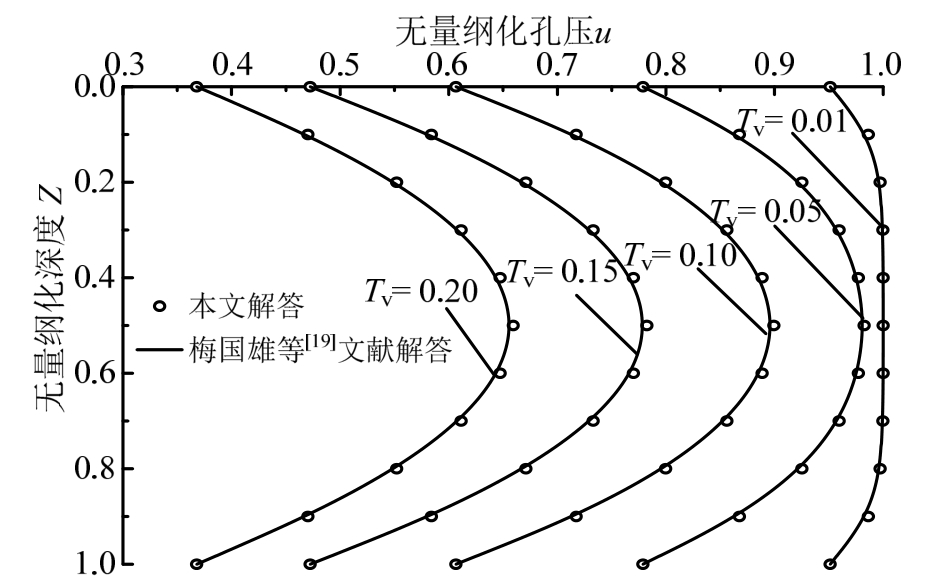 为了验证文中解析解的正确性,笔者编制了计算程序,将本文解答和梅国雄等[19]文献给出的连续排水边界下骤加荷载作用的一维固结解析解进行对比,计算结果如图4所示。
