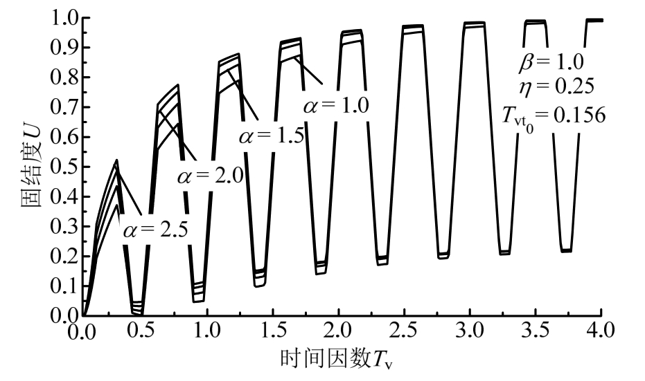 下的固结度变化曲线。从图3可知,通过调节加荷系数