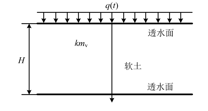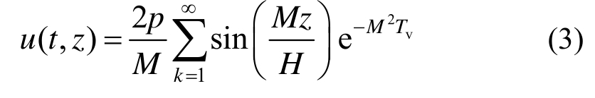 本文固结模型除去荷载情况外,其余假设与太沙基一维固结理论作相同的假设,计算模型如图2所示,地基只考虑双面排水条件。对于单面排水,当上下面排水性能一样时,只需要将软土厚度H调整为其一半,即可以得到单面排水条件下的解答。