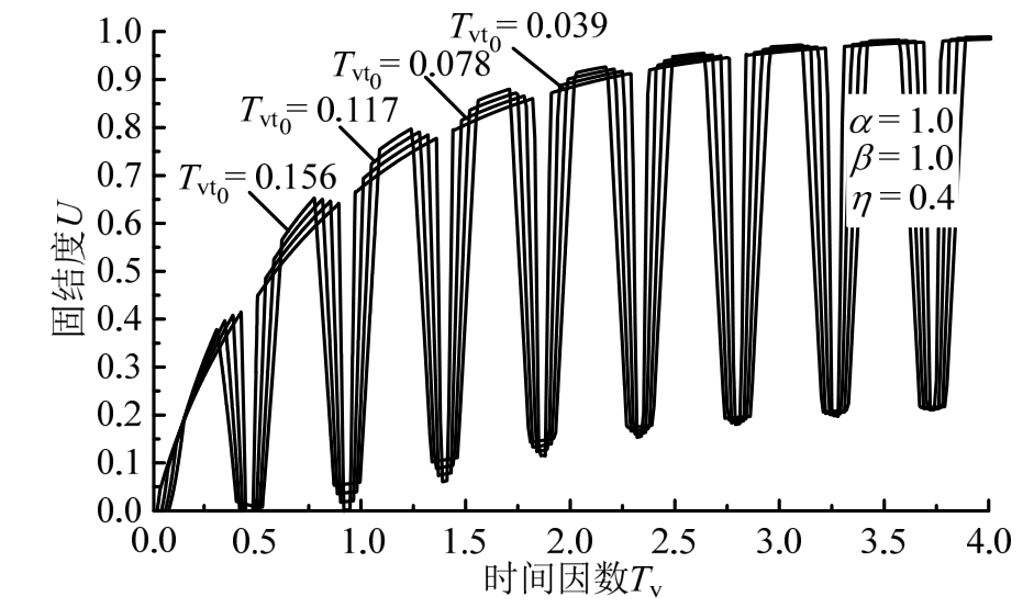 (3) 界面参数不变时,加荷系数Tvt0越小,在每个循环荷载作用周期内,荷载的加卸荷阶段的加卸荷速率越大,固结速度越快,恒载作用时间越长,固结度变化范围越大。