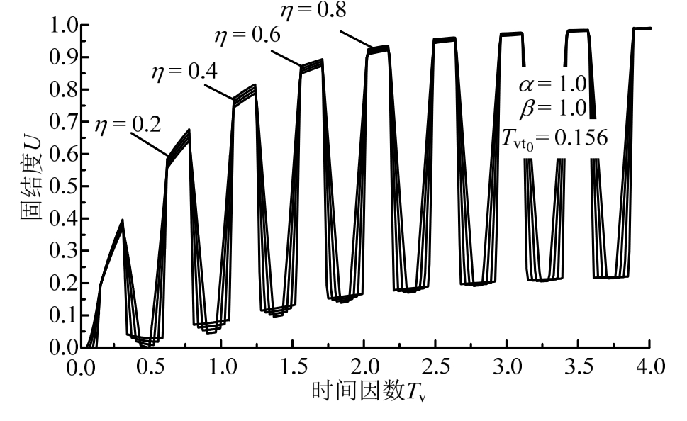 图7给出了不同的加荷系数η下的固结度变化曲线。从图3可知,通过调节加荷系数η即可调节梯形荷载在加载和卸载阶段的速率,加荷系数η越大,在每个循环荷载作用周期内,荷载的加卸荷速率越大。从图7可见,当界面参数不变时,加荷系数η越大,在每个循环荷载作用周期内的加卸荷阶段,固结速度越快,在恒载阶段,固结度的最大值也越大。