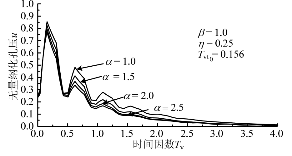图5给出了无量纲化深度Z=0.5时,取不同界面参数,无量纲化孔压随时间因数vT的变化曲线。从图中可以看出,界面参数α越大,孔压整个固结过程消散速率也越快。在每个循环荷载作用周期内,恒载阶段孔压的最大值不断减小,最终趋向于零。