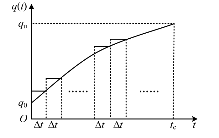 由于荷载随时间变化,原来骤加荷载为p时的连续排水边界条件不再适用。如图1所示,为了表示变荷载作用下的连续排水边界条件,取变荷载初始值为q0,加荷时间为tc,荷载最大值为qu,在加荷时间tc段之内将其分为n段,每段取Δt,变荷载即可看作是分级瞬时加载,可得nΔt段荷载作用的连续排水边界表达式: