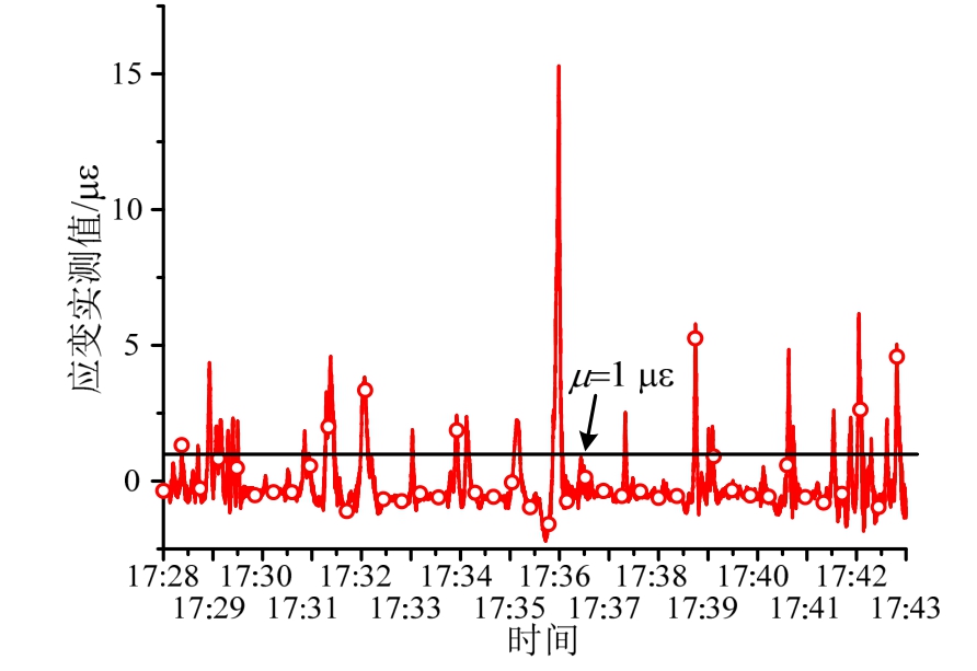 采用统计各测点剩余应变监测值中超过一定阈值的极值数量的方式实现对一定时间内通过桥梁车辆数目的识别[13]。找出动应变时程曲线中的所有超过一定阈值的极值点的数目,由于经过处理后的动应变时程存在误差,可能存在波动,因此应合理设置阈值μ,凡大于阈值的极值点才被统计[12],如图14所示。取阈值为1 με,在Sx24的应变时程中,统计得到超过1 με阈值的极大值点为59个,即可粗略估计2016年9月25日17∶28∶00~17∶43∶00的15 min中,有约59辆车通过该桥,在该测点产生的拉应变超过1 με。根据相应时间段的监控录像,数出15 min内过桥车辆数目为61,验证了该方法的有效性。