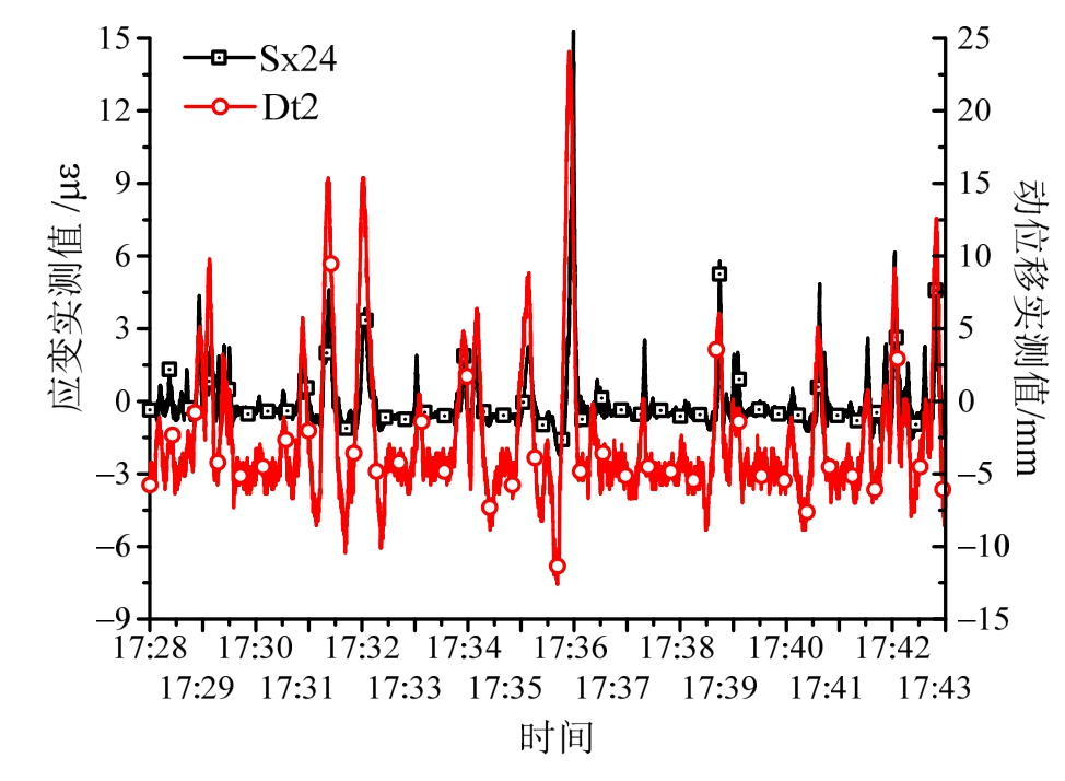 取相同的15 min时间段(17∶28∶00~17∶43∶00),将布置于该斜拉桥东跨跨中南箱底板的动挠度测点Dt2与应变测点Sx24在此期间的去除温度效应的响应进行比较,结果如图12所示。由图中可见,动应变及动挠度在相同时刻达到极值,可见应用平均值方法准确地排除了应变监测数据中的温度效应,经处理后的应变值是由动荷载产生的。