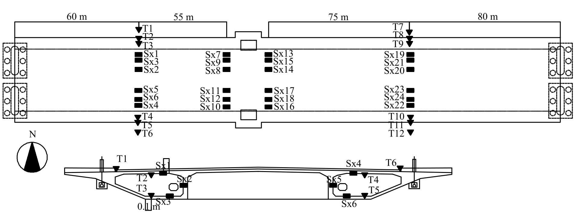 主跨桥梁结构安装了在线安全监测系统,包括温度、应变、竖向挠度、加速度、索力等传感器。由于监测传感器均为桥梁投入使用一段时间后安装,传感器实测数据中不包含桥梁自重及混凝土早期收缩徐变等效应的影响,主要监测桥梁结构在正常使用条件下,在温度效应、车辆荷载等荷载或作用下的响应以及由于材料劣化或结构损伤等产生的变化。基于结构有限元模型分析,主桥应变传感器布设于靠近跨中与靠近塔柱的箱梁上与主塔的塔柱上,采用电阻式应变传感器,采样频率为9 Hz;主桥温度传感器布设于跨中(与跨中应变测点在同一截面),采用热电偶传感器,通过打孔方式安装在箱梁混凝土内,每隔10 min采样1次。主桥结构上的应变及温度传感器布置如图2所示。同时,为了测量主桥桥塔的温度变化,在桥塔靠近桥面一定高度装有4个温度传感器与应变传感器。