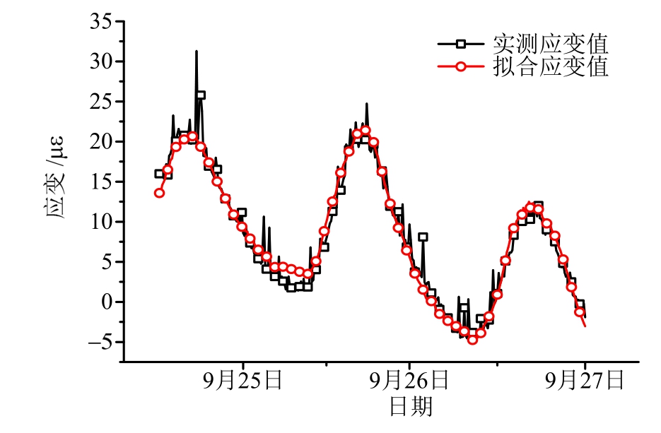 目前,已发展了一些从桥梁结构应变响应中分离出环境温度效应成分的方法。从桥梁结构总应变响应中剔除温度效应成分可视为从时间序列中提取周期趋势项的问题,以此为基础,Bendat等[6]提出ARMA时间序列模型,可根据样本数据对平稳时间序列进行预测,从而提取出周期趋势项;陈夏春、梁宗保等[7―8]提出可以将多元线性回归模型用于提取桥梁结构中的温度效应;对于非平稳信号,由Huang等[9]提出的经验模态分解法(EMD)能够将确定温度应变与周期趋势相关的多阶本征模态函数(IMF)叠加,从而提取出温度效应成分,李苗等[10]将该方法应用于桥梁应变温度效应的提取;考虑到结构监测信号的多尺度特性,刘纲等[11]提出可采用自适应带宽滤波的方法,结合回归统计从监测信号中分离温度效应;Tang等[12]提出可以通过小波分析提取监测信号的变化趋势,涂成枫、吴佰建等[13―14]将小波分析用于提取应变监测数据中的温度效应成分。
