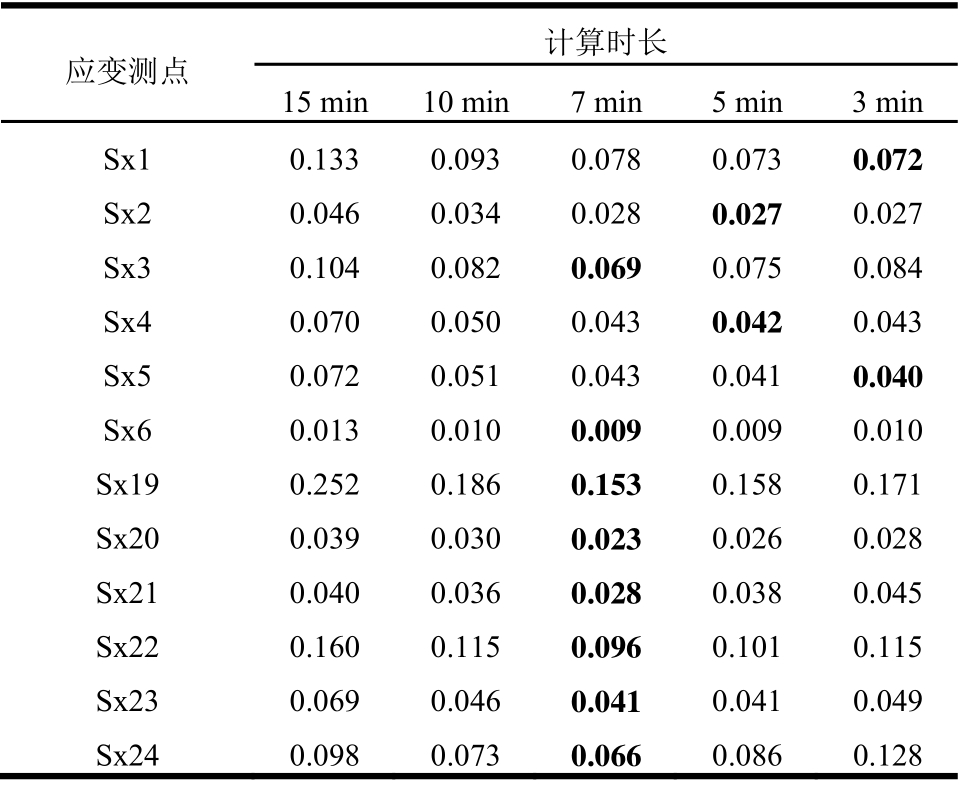 应变测点 计算时长15 min 10 min 7 min 5 min 3 min Sx1 0.133 0.093 0.078 0.073 0.072 Sx2 0.046 0.034 0.028 0.027 0.027 Sx3 0.104 0.082 0.069 0.075 0.084 Sx4 0.070 0.050 0.043 0.042 0.043 Sx5 0.072 0.051 0.043 0.041 0.040 Sx6 0.013 0.010 0.009 0.009 0.010 Sx19 0.252 0.186 0.153 0.158 0.171 Sx20 0.039 0.030 0.023 0.026 0.028 Sx21 0.040 0.036 0.028 0.038 0.045 Sx22 0.160 0.115 0.096 0.101 0.115 Sx23 0.069 0.046 0.041 0.041 0.049 Sx24 0.098 0.073 0.066 0.086 0.128