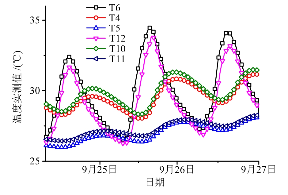 该斜拉桥主桥箱梁温度传感器分别布置在东西两跨跨中的南北两箱的上中下三个截面上(图2),其中T1及T6、T7及T12位于跨中截面箱梁外部的桥面上,T2、T4、T8及T10位于跨中截面箱梁的顶面内部,T3、T5、T9及T11位于跨中截面箱梁的底面内部。因各传感器所处位置不同,受日晒及温度变化的影响也均不同。取2016年9月25日至9月27日共3日中的实测温度数据进行统计,对主桥结构的温度分布进行分析。