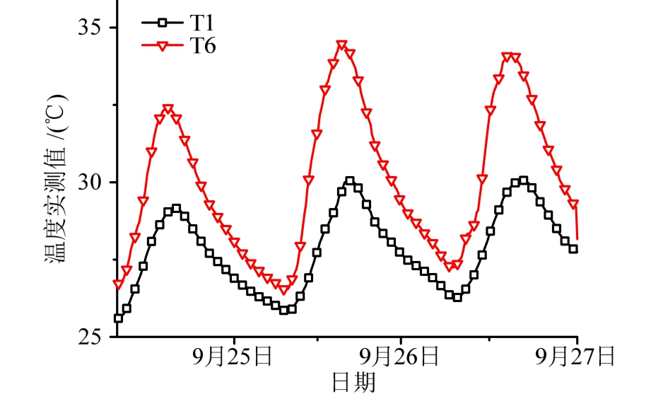 图4为该斜拉桥主桥西跨主梁外部顶板温度传感器实测的温度变化曲线。可以看出:1) 在两个截面上,南侧箱梁外部顶板测点(T6)的温度最大值和昼夜温差变化均大于北侧箱梁顶板测点(T1)处的结果,这是由于正午时太阳在南方,南侧箱梁的外部顶板测点受日晒影响大;2) 由于混凝土内热传导需要时间,因此箱梁外部顶面的温度变化趋势与大气温度的变化相比略有滞后,实测温度最大值在每天16时左右出现。