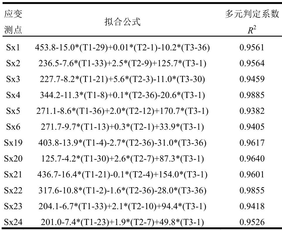 应变测点 拟合公式 多元判定系数R2 Sx1 453.8-15.0*(T1-29)+0.01*(T2-1)-10.2*(T3-36) 0.9561 Sx2 236.5-7.6*(T1-33)+2.5*(T2-9)+125.7*(T3-1) 0.9564 Sx3 227.7-8.2*(T1-21)+5.6*(T2-3)-11.0*(T3-30) 0.9459 Sx4 344.2-11.3*(T1-8)+0.1*(T2-36)-20.6*(T3-1) 0.9885 Sx5 271.1-8.6*(T1-36)+2.0*(T2-12)+170.7*(T3-1) 0.9382 Sx6 271.7-9.7*(T1-13)+0.3*(T2-1)+33.9*(T3-1) 0.9405 Sx19 403.8-13.9*(T1-4)-2.7*(T2-36)-31.0*(T3-36) 0.9617 Sx20 125.7-4.2*(T1-30)+2.6*(T2-7)+87.3*(T3-1) 0.9640 Sx21 436.7-16.4*(T1-21)-0.1*(T2-4)+154.0*(T3-1) 0.9601 Sx22 317.6-10.8*(T1-2)-1.6*(T2-36)-28.0*(T3-36) 0.9855 Sx23 204.1-6.7*(T1-33)+2.1*(T2-10)+94.4*(T3-1) 0.9418 Sx24 201.0-7.4*(T1-23)+1.9*(T2-7)+49.8*(T3-1) 0.9526