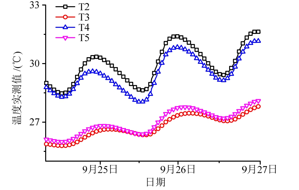 图5给出了3日内该斜拉桥主桥西跨跨中主梁截面处箱内顶板测点(T2及T4)及底板测点(T3及T5)的温度变化曲线。可以看出:1) 沿桥横向方向,箱内顶板及底板测点的温度最大值和昼夜温差变化规律基本一致;2) 箱内顶板及底板测点达到温度最大值的时刻基本一致,与大气温度的变化相比滞后明显,最大值在23时左右出现。