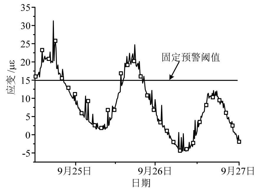 应变是桥梁结构安全监测的重要参数之一。通过应变监测,可以对桥梁结构进行安全预警和状态评估。但桥梁结构各处的应变通常会受到环境因素的影响,其中,温度是影响监测点应变的主要环境因素[1]。温度作用会产生较大的温度应力,导致恒载和车辆活载引起的结构应变信息被掩盖[2―3],同时使得桥梁在线监测系统中预先设置的固定应变预警阈值无法实现有效预警,如图1所示。因此,有必要确定结构应变监测中的温度效应,并将之从实测的总应变中分离,以便进行车辆荷载识别和安全预警;同时可将实时分离出的温度效应加入预先设置的固定应变预警阈值中,实现动态应变预警阈值的设置。