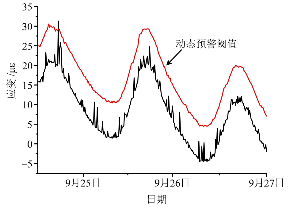 将分离出的温度效应叠加预先设置的固定应变预警阈值,可得到随温度变化的动态应变预警阈值,结果如图11所示,由此,可以实现对考虑温度效应的实测应变值进行有效预警。