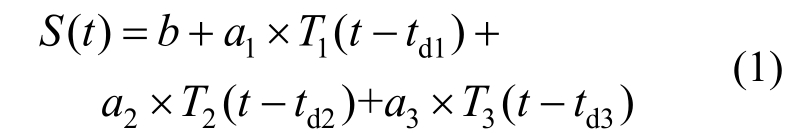 其中:b及ai(i = 1,2,3)为多元线性模型中的回归参数,S为测点处监测应变响应,单位为με;Ti(i = 1,2,3)为各温度作用,单位为℃;tdi(i = 1,2,… ,n)为测点应变相对于各温度作用的滞后时间,采用对应变监测值与相应温度作用作相关分析计算得出,单位为10 min。