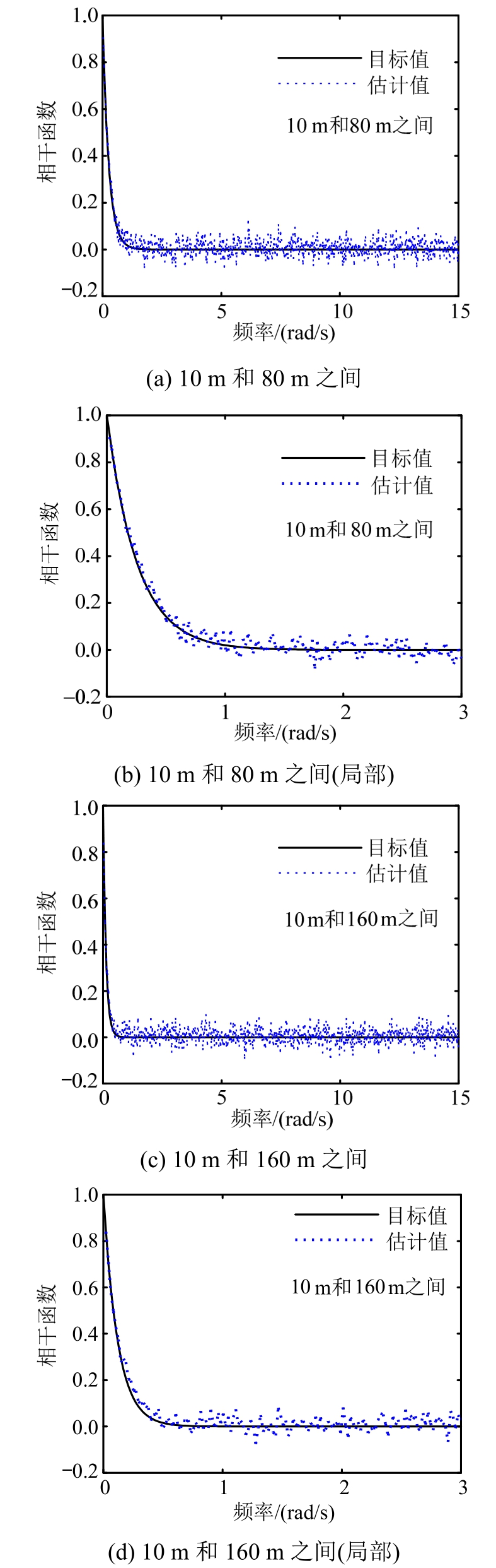 相干函数估计值与目标值的对比如图5所示。可以再次看到,相干函数估计值与目标值趋势一致,并在目标值附近波动,总体吻合良好。