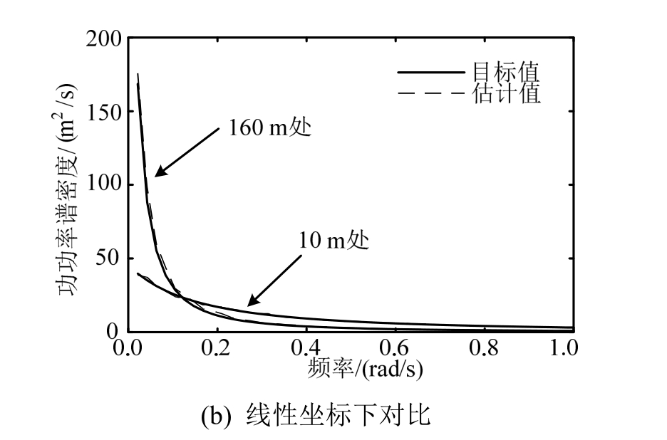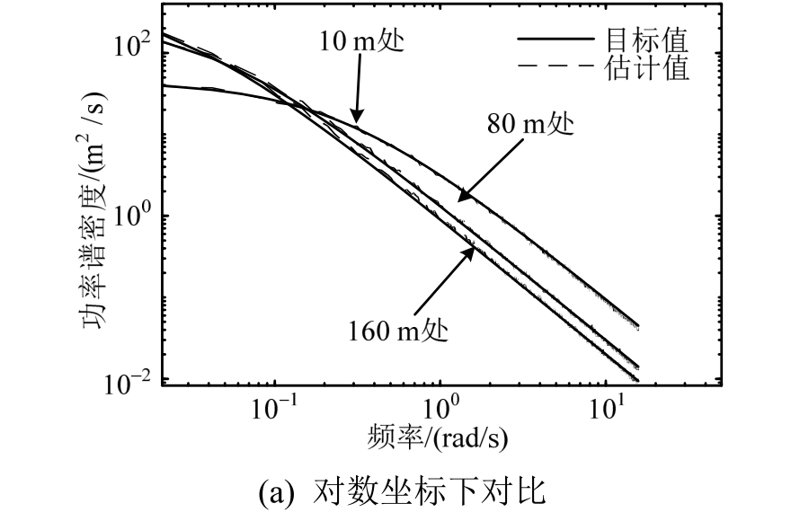基于生成的500个样本,估计了不同高度处的自功率谱,并与目标谱进行对比,结果如图3所示。可以看到,不同高度处的自功率谱估计值均与目标值吻合良好。