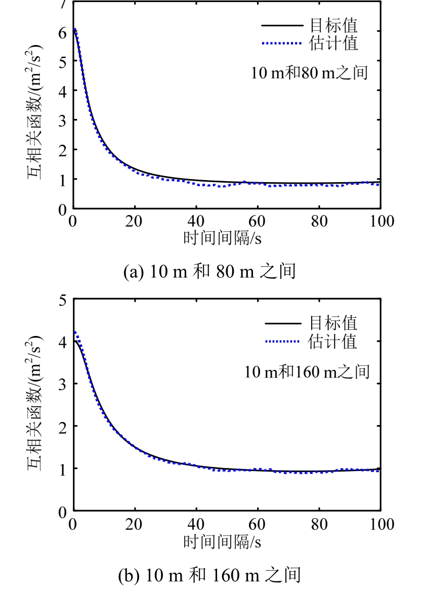 同样基于500个样本,对两点之间的互相关函数进行了估计,并与目标值进行了对比,结果如图4所示,可见互相关函数的估计值和目标值也吻合良好。