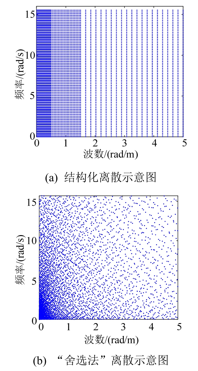 需要注意的是,式(31)是基于波数和频率两个方向均匀离散的结果。更重要的是,式(30)的联合功率谱,其能量主要分布在距原点较近的区域,且谱值变化很快,同时联合功率谱具有较长的尾部。且空间高度越高(z越大),这一特征越明显。由于这些特征,在均匀离散时为了能够较为准确地刻画功率谱在频域-波数域上的能量分布情况,在频率方向上需要离散数目为 103量级的频率点,而在波数方向上需要离散量级近 104的波数点,因而总的点数达到 1 06 ~107量级,这导致了很大的计算量。为了进一步提高效率,可以采用非均匀离散的思想,即在联合功率谱谱值较大的区域离散点较为密集,而在其它区域则较为稀疏,由此可以显著减少总的离散点数,从而大大降低计算量。为此,本文提出“结构化”和“舍选法”思想的两种非均匀离散方式。
