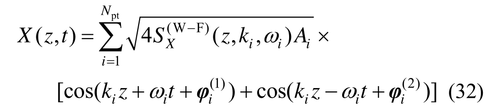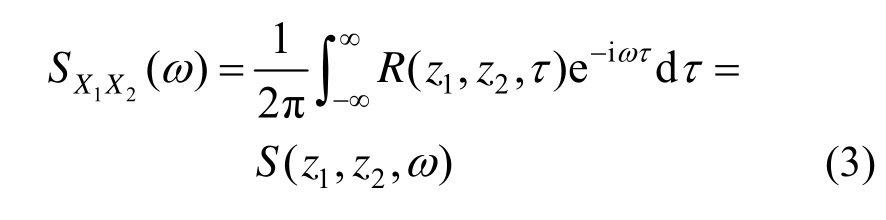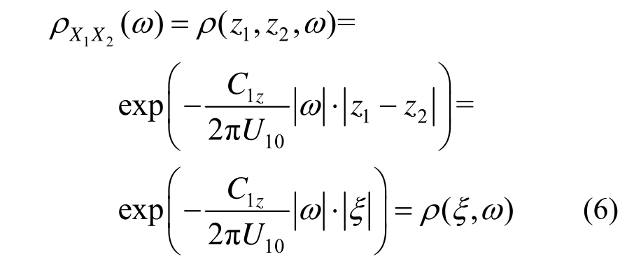 现在考虑随高度变化的脉动风速功率谱密度函数,此时脉动风场是非均匀的。记z高度处脉动风速时程X(z,t)的自功率谱密度函数为SX(z,ω),则不同高度处两点脉动风速时程X(z1,t)和X(z2,t)的互功率谱密度函数为: