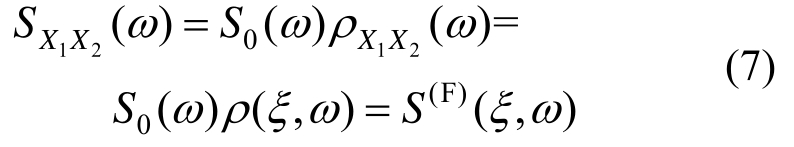 对式(2)关于时间间隔τ进行Fourier变换,可以得到空间两个不同点处脉动风速的互功率谱密度函数: