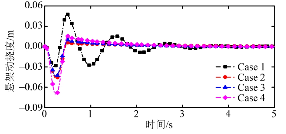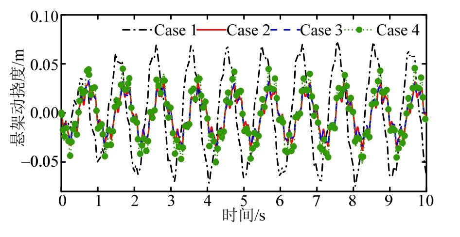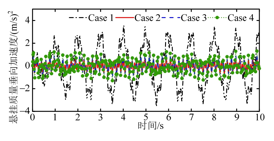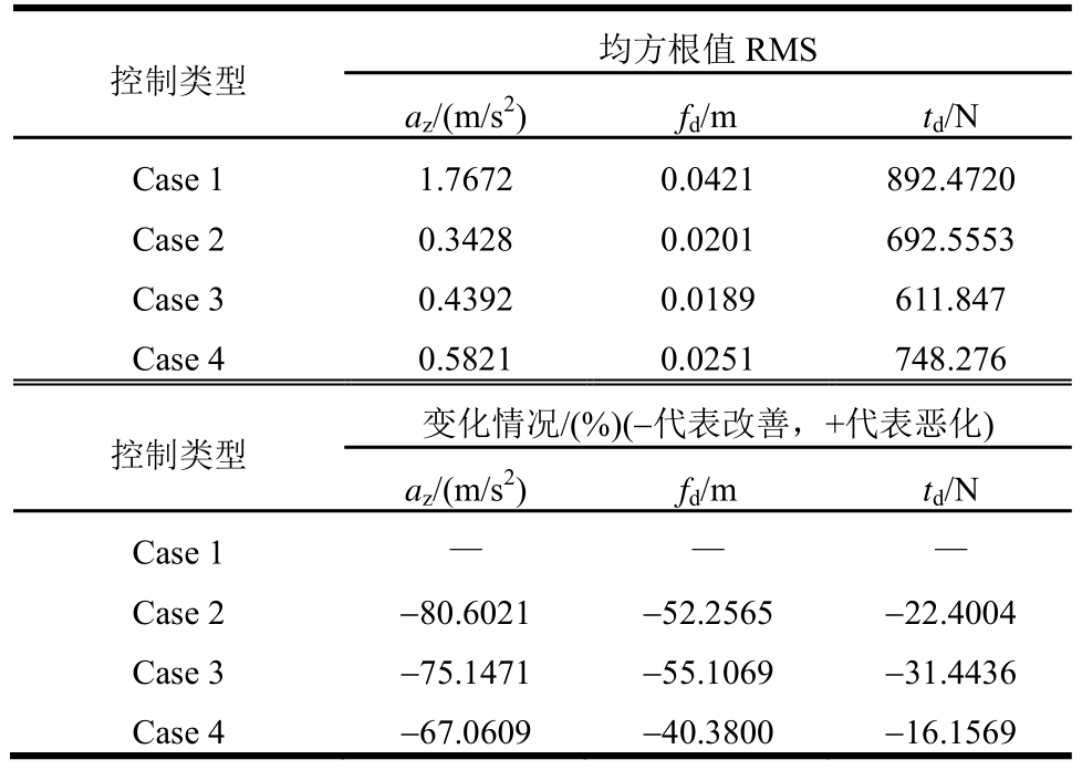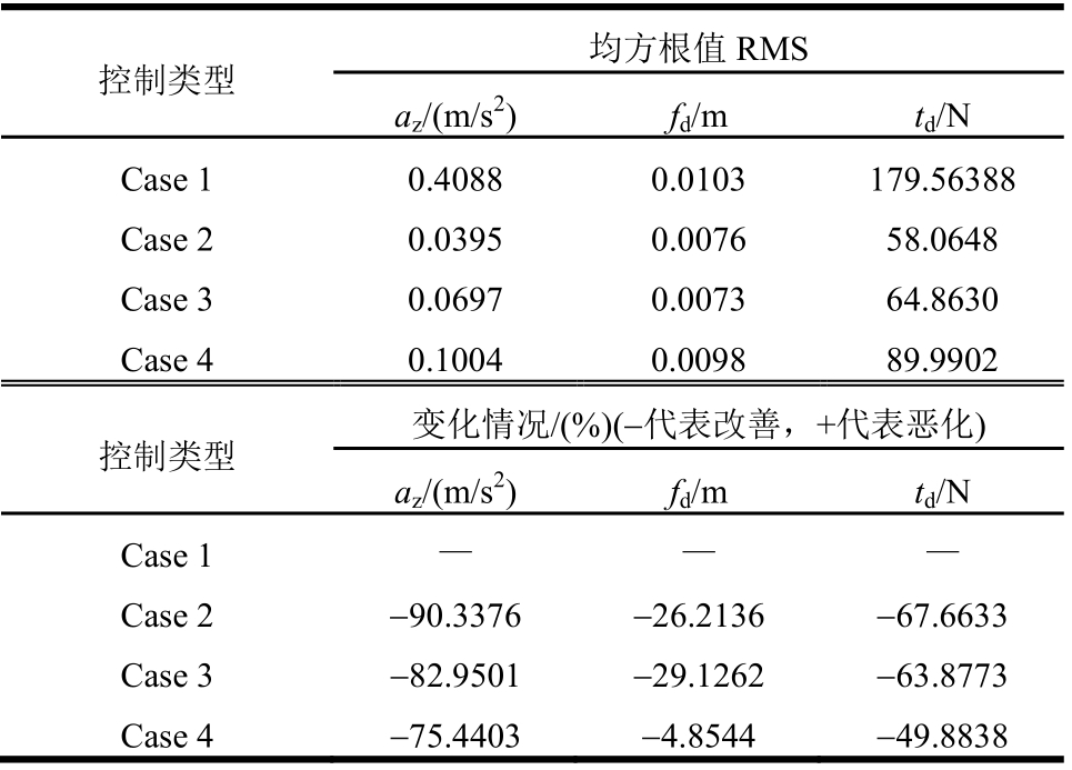 控制类型 均方根值RMS az/(m/s2)fd/mtd/N Case 1 0.4088 0.0103 179.56388 Case 2 0.0395 0.0076 58.0648 Case 3 0.0697 0.0073 64.8630 Case 4 0.1004 0.0098 89.9902控制类型 变化情况/(%)(-代表改善,+代表恶化)az/(m/s2)fd/mtd/N Case 1 — — —Case 2 -90.3376 -26.2136 -67.6633 Case 3 -82.9501 -29.1262 -63.8773 Case 4 -75.4403 -4.8544 -49.8838
