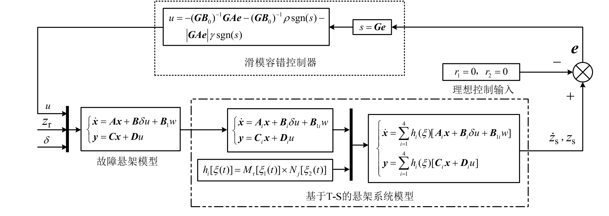 其中,α和β为自适应学习率。图3为基于T-S模糊模型的主动悬架滑模容错控制原理结构图。