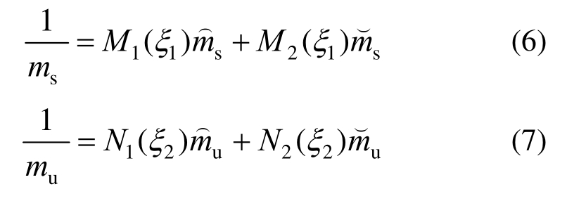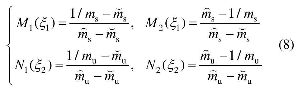 上述提到作动器故障控制输入具有一定不确定性,同时由于车身载荷或乘坐人数的变化使得悬挂质量ms和非悬挂质量mu在一定范围内变化。因此,主动悬架系统不确定性参数包括ms、mu和作动器不确定控制输入uf,且参数ms和mu应在给定载荷范围内变化,即msmin≤ms≤msmax,mumin≤mu≤mumax。定义ξ1=1/ms,ξ2=1/mu,参照文献[31]中非线性方法,可得1/ms和1/mu的值分别为: