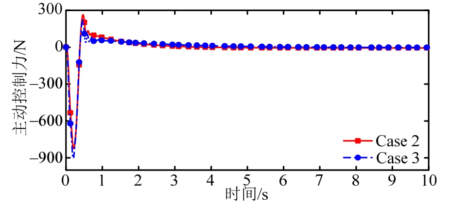 Fig.7 The variation of active control forceu in Case 2 and Case 3 under bump road disturbance