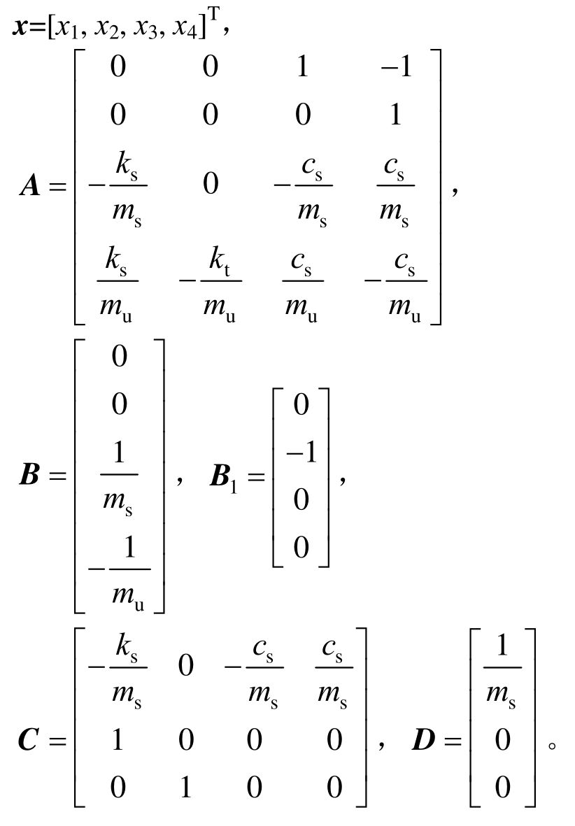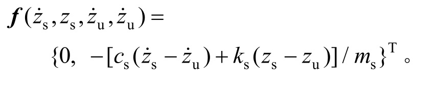 选取悬架动挠度x1=zs-zu,轮胎动位移x2=zu-zr,悬挂质量的垂向速度x3=