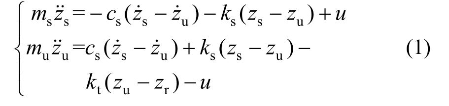 为简化悬架动力学分析及其控制器设计的复杂度,建立1/4车辆的二自由度的悬架动力学模型如图1所示。其中,ms为悬挂质量;mu为非悬挂质量;zs、zu分别为悬挂质量和非悬挂质量的垂向位移;zr为随机路面输入;cs、ks分别为悬架系统的阻尼和刚度;忽略轮胎阻尼,kt为轮胎刚度。
