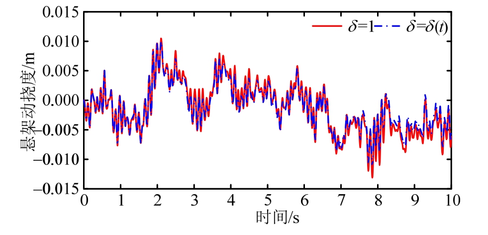 图12~图14为被控悬架模型正常工作(δ=1)和发生时变故障(δ=δ(t))的时域响应曲线。通过分析悬架动特性曲线可知,在整个时域内,故障模型的悬挂质量垂向加速度、悬架动挠度和轮胎动载荷三个指标相对于正常工作的悬架系统的跟踪精度都比较高,其中悬架动挠度的误差保持在5%以下,悬挂质量垂向加速度的误差保持在10%以下,轮胎动载荷的误差也保持在10%以下。这说明被控悬架在发生故障(δ=δ(t))情况下,仍然能够很好地跟踪正常工作(δ=1)的悬架系统,使系统具有良好的鲁棒性,从而故障模型可以较好地得到与正常工作模型一致的控制效果。