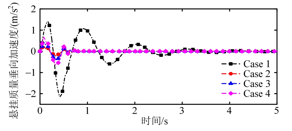 路面式(38)是模拟车体共振频率(1 Hz)与高频干扰叠加的粗糙路面,图8~图10为粗糙路面下四种不同案例情况下主动悬架的时域响应曲线。