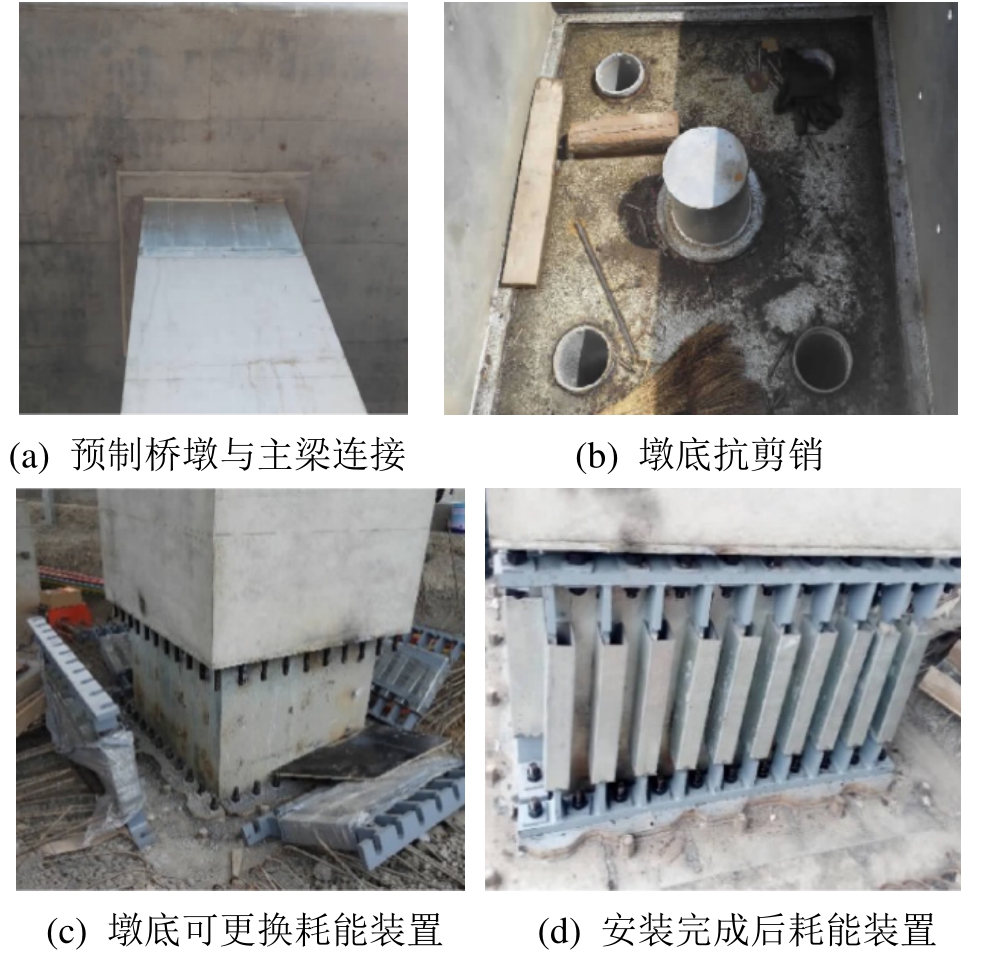 向具有更高抗震需求的桥梁拓展。近年来,随着韧性抗震理念的推广,桥梁抗震设计逐步由抗倒塌设计向震后功能可恢复设计的方向发展,即要求桥梁下小震下具有自复位的能力,在大震下具有使用功能可快速恢复的能力。如前所述,外置可更换耗能装置的“非等同现浇”预制桥墩是实现震后功能可恢复桥梁的重要方法,利用这种结构形式桥墩在黄徐路桥已经进行了试点[88]。黄徐路桥抗震设防类别为B类,场地类别为Ⅲ类,设防烈度为8度,为两跨 40 m现浇预应力混凝土连续梁桥,中墩采用摇摆桥墩,两边墩采用滑板支座,边墩构造上设置抗震设施。如图 26所示,摇摆桥墩分为三大部分:两端设置摇摆界面的独立桥墩、墩柱内竖向无黏结预应力索和墩底耗能装置。这是我国首次把外置可更换耗能装置的“非等同现浇”预制桥墩应用到实际桥梁工程中,为预制桥墩体系在中高烈度区桥梁的推广提供了借鉴,但针对外置可更换耗能装置“非等同现浇”预制桥墩的设计计算方法仍需要进一步的发展和完善。