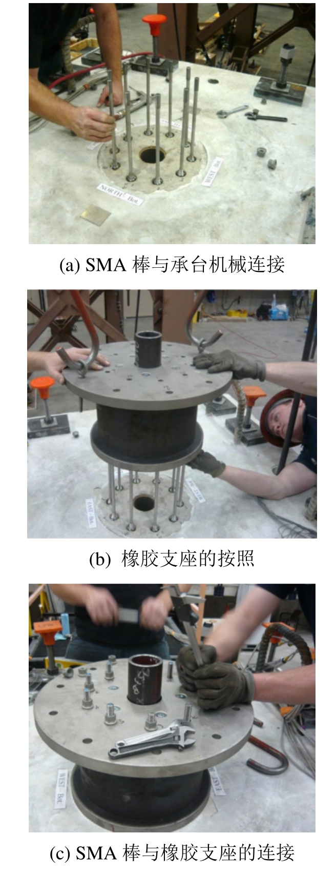 Tazarv等[74]将SMA棒代替塑性铰区钢筋用于波纹管灌浆连接“等同现浇”预制桥墩,如图 20所示,塑性铰区以外部分仍采用普通钢筋,SMA棒与普通钢筋之间通过机械连接,并针对这一新型桥墩开展了拟静力试验研究,证明该新型桥墩与同参数现浇桥墩相比,具有更优的变形能力,耗能能力基本相当,残余变形则减小79%。随后的研究中,SMA棒与橡胶支座被 Varela等[72]用于制作一种可更换塑性铰区,如图 21所示,振动台试验证明了这种新型“非等同现浇”预制桥墩在抗震性能和震后快速修复方面的优势。