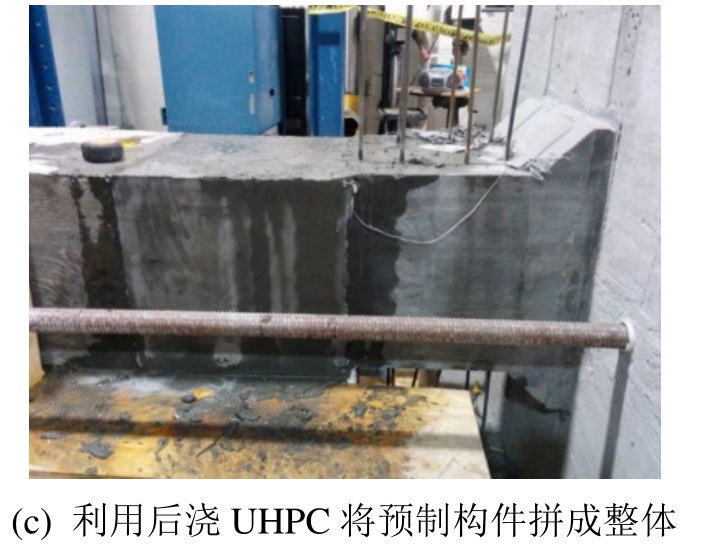 超高性能混凝土(Ultra High Performance Concrete, UHPC)被法国土木工程协会定义为抗压强度介于 150 MPa~250 MPa的新一代水泥基复合材料[56],材料水灰比一般介于 0.17~0.25之间,可以通过较高的纤维掺量实现材料的应变硬化特性,需要严格控制骨料粒径或直接不添加粗骨料,具有高强度、高延性、高耐久性的材料优势,用于制作预制构件,可以减轻吊装重量,提高受力复杂区的变形能力,降低全寿命周期成本[57];同时,UHPC与钢筋之间具有超高的粘结强度,用作灌浆料使用,可以大大缩短钢筋的锚固长度,提高后浇区钢筋与混凝土的协调工作能力[58]。